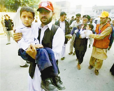 巴基斯坦西北边境省首府白沙瓦一所警察局附近16日上午遭到爆炸威力巨大的自杀式汽车炸弹袭击,造成至少6人死亡、36人受伤。这是白沙瓦8天来遭到的第5起自杀式袭击。图为救援人员抱着受伤儿童赶往附近医院救治。