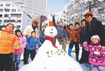 11月17日,“志愿家长”带领停课的中小学生在社区内堆雪人。受11月16日暴雪影响,合肥市中小学校停课放假两天。该市亳州城社区居委会组织社区志愿者临时担任“志愿家长”,组织停课的学生学习、做游戏,帮家长解决后顾之忧。 新华社 虞俊杰 摄