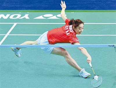 11月18日,中国选手王适娴在比赛中救球。当日,2009中国羽毛球公开赛在上海浦东源深体育馆进行,王适娴在女子单打第一轮比赛中以2比1战胜法国选手皮红艳,晋级下一轮。 新华社记者 王雷摄