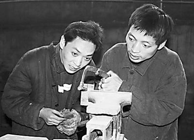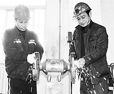 在安徽淮北矿业孙疃煤矿机修厂刚刚结束的“五小发明”比赛中,陆文虎(右)和师弟张明亮改造的打磨机获得一等奖,工友们笑称他俩是天天对着干的“黄金搭档”。这哥俩曾在一个师傅门下学艺,平时,他们在生活上互相关心,但在工作上却互不服气,动不动就赛谁干活质量好,比比谁打磨的零件多。11月18日,俩人又在打磨插杆上较起劲来。王 亮 摄