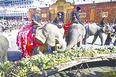 泰国是世界上产象大国,大象在泰国文化中享有很高地位。在产象最多的素辇市,每年11月底都要举行大象盛会,这是当地最富有特色的传统宗教节日。图为大象在驯象师指挥下正在享用丰盛的自助餐。肖劼 供图