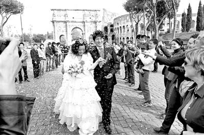 11月17日,务工于意大利罗马城“中国商业街”的温州籍劳务工林欣和菲菲在20多位中国老乡的簇拥下,来到罗马著名的景点斗兽场和君士坦丁门前幸福地举办了因金融危机而推迟了一年多的婚礼。自今年第三季度起他们的服装店生意有所好转。本报记者 于文国 摄