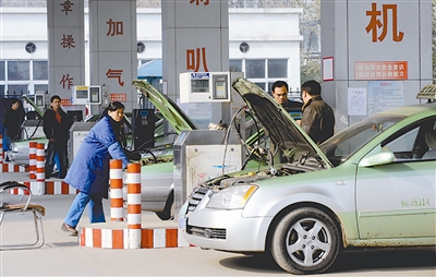 11月23日,一些出租车在郑州市一家天然气站加气。郑州市公交总公司发布消息,从23日零时起郑州市7座公交车加气站中的5座暂停对出租车加气。进入冬季,天然气用气量大幅增加,河南郑州市出现车用燃气和居民生活用气短缺。