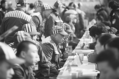 11月19日,即将刑满释放的服刑人员在一家企业的招聘台前咨询填表。当日,河南省即将刑释人员就业招聘会在豫西监狱举行,来自河南、山东、江苏、浙江等39家用人单位将数百个工作岗位送进了高墙院内。老牛 摄