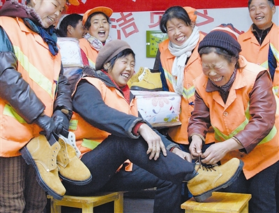 11月23日,在同伴的帮助下第一次穿上翻毛皮鞋的保洁员王彩霞高兴不已。