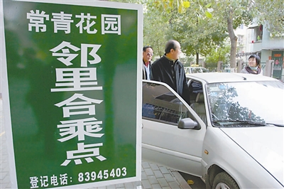 今年10月底以来,武汉市常青花园社区组织了数百辆贴着“邻里合乘”统一标志的私家车上路。通过社区组织、法律专家参谋、签订协议,该社区探索拼车合法化、常态化,目前报名合乘的车主达到360名。孙新明 摄