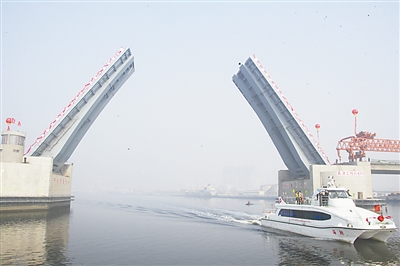 海河开启桥由中国铁建十四局集团三公司承建。据该公司总工程师刘运平介绍,该桥全长868.8米,跨径76米,净跨68米,为亚洲同类最大跨度开启桥。
