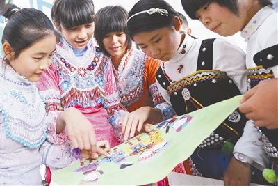 11月23日云南省红河哈尼族彝族自治州开远市第五中学的几名少数民族学生在讨论自己的绘画作品。