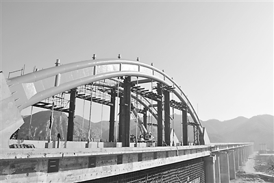 以往建桥都是下承式受力,而在太(原)中(卫)银(川)铁路线上却有一座上承式受力桥,因为桥下有8车道高速公路,建设者最终将其设计为上承式受力,而且一孔跨度为82.5米。日前,这这座上承式受力钢管拱桥由中铁十六局二公司顺利建成,成为陕北通道中的一道亮丽的景观。牛士红 石会婷 摄