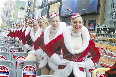 11月24日,在美国纽约时报广场,“火箭女郎”搭乘一辆双层观光巴士与游客见面。当日,纽约无线电城的11名“火箭女郎”和“圣诞老人”一同搭乘双层观光巴士亮相时报广场,庆祝2009年节日季的到来。