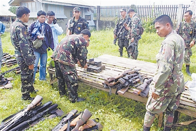 11月26日,在菲律宾马京达瑙省,士兵检查收缴的大量枪支。菲律宾军方当日说,菲武装部队当天上午已控制马京达瑙省首府沙立夫阿瓜克市,该省省长安达尔·安帕图安之子、绑架和屠杀事件主要嫌疑人小安达尔·安帕图安已向当局自首。 新华社发(阿斯纳尔 摄)