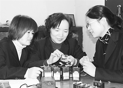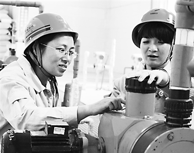 盘点2009,中煤大屯龙东煤矿职工李云(右)感到特幸福,她不仅拿到大专文凭,而且被聘为高级工,涨了工资还拿了奖学金。她发明的CJC4型智能甲烷测试器快速检测法解决了矿上难题。更让她开心的是班里遇到大小难题工友们总请她当指导。11月24日一早,她又指导同班两位姐妹检修CJC4型智能甲烷测试器。周长好 游庆来 摄