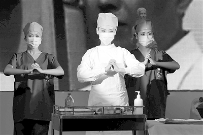 11月26日,在北京市总工会举办的“北京市机关事业系统劳动竞赛成果展示会”上,医护人员正在舞台上展示劳动竞赛场面。当天,北京多个事业机关现场展示劳动场面,把劳动竞赛搬上了舞台。 周民 摄