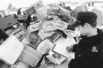 11月24日,新疆乌鲁木齐市公安局集中销毁赌博游戏机,将在为期一个月的游艺娱乐场所专项整治行动中收缴的游戏机电脑主板1000余块、游戏机150台、显示屏16个以及部分赌博用具全部销毁。图为一名执法人员在登记准备销毁的赌博游戏机。 新华社发 江文耀 摄