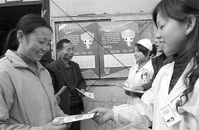 11月30日,医务人员向农民工发放艾滋病防治宣传册。