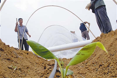 11月29日,广西隆安县那桐镇的蕉农在给错峰种植的香蕉苗覆盖防寒薄膜。