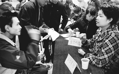 11月26日,一位工作人员正在用哑语与应聘人员交流。当日,安徽省芜湖市残联举办“2009年残疾人就业专场招聘会”,18家企业为残疾人提供126个就业岗位,招聘的职位有装配工、操作工、清理工、保洁工、勤杂工、缝纫工、服务员等。戚良鹏 张丽 摄