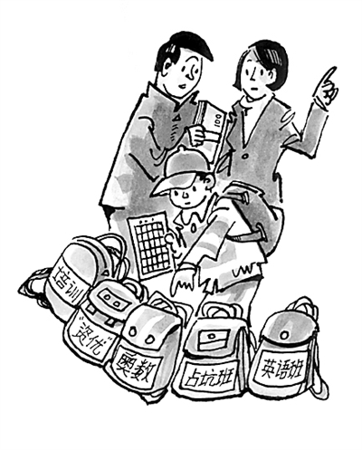 据《京华时报》报道,北京一些家长自爆孩子“小升初”培训账单,中等水平的培训费一年要7万余元。为了上各种培训班,有的家长给孩子准备了5个书包,装不同的培训书本。