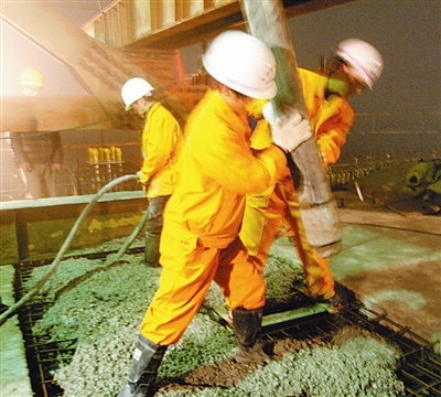 12月2日凌晨零时28分,中铁十二局集团承建的京沪高铁四标段淮河特大桥主桥工地,建设者冒着严寒在浇筑最后一段混凝土。经过600个日夜的鏖战,淮河特大桥主桥当日正式合龙。