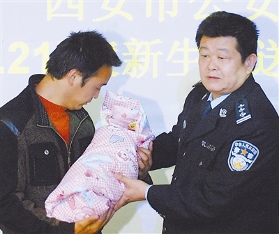 12月2日,在西安交通大学第一附属医院举行的“11·21案新生儿送归仪式”上,民警把婴儿交到其父严小红手中。12月1日晚,当警方将这名被拐婴儿从广东东莞解救回到陕西西安后,通过亲子鉴定得出“被拐女婴系严小红、张兰芳生物学之女”的结论。 新华社记者 丁海涛摄