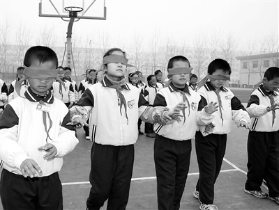 为迎接12月3日国际残疾人日,山东博兴县博奥小学开展“体验残疾人生活,培养助残爱心”活动,让小学生亲身感受残疾人在生活中遇到的障碍与艰辛,让孩子们从小理解、关爱残疾人。 新华社发 (陈彬 摄)