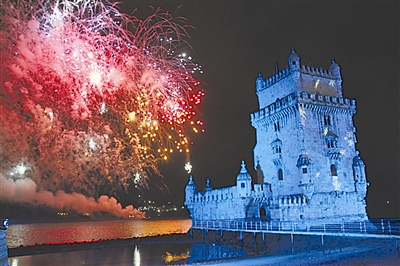 12月1日,在葡萄牙首都里斯本,焰火照亮世界文化遗产贝伦塔。庆祝《里斯本条约》正式生效。 新华社发
