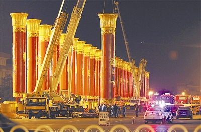 12月3日凌晨,北京天安门广场上象征民族大团结的56根民族团结柱,经北京住总集团等单位的施工,已从天安门广场全部拆除,进行回厂维护。图为12月2日夜,北京天安门广场上的56根民族团结柱开始撤离时的一个镜头。 郭新 摄