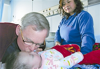 12月3日中午,在北京清华大学第一附属医院,来自天津牧羊地儿童村的医疗部主任牧迪大夫亲吻熟睡中的孤残儿童党嘉欣。