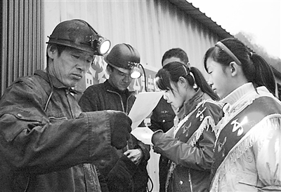12月2日,在吉林省临江市四道沟镇煤矿井口处,孩子们把亲手画的安全漫画送给正准备下井的爸爸。12·4全国普法宣传日到来之际,吉林白山公安边防民警在辖区煤矿工人子女中开展了“我是矿区小小普法宣传员”的活动。 赵建龙 摄