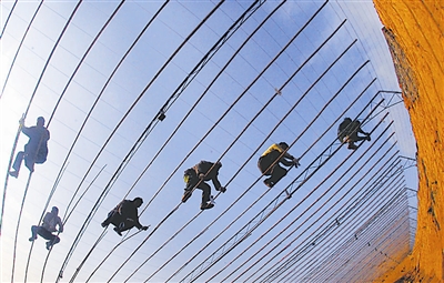 12月3日,几位菜农在蔬菜大棚顶上扎棚架。