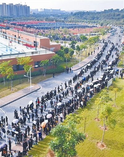 12月2日,广东省高校本科生专场招聘会在中山大学大学城校区举行。本科生专场历年来进场人数都居高不下,今年更是达到2.8万人次,学生进场排队最长时超过一公里。有毕业生从早上8时排到11时,才拿到临时门票。如果算上进场检票和等候面试,这些学生要经过4个小时才能见到面试官,接受时间仅为几分钟的面试。