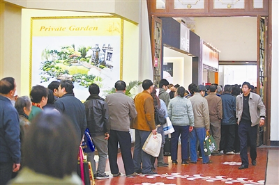 12月5日,上海房展会吸引了不少购房者。在一家房产商的展台前,登记会员的市民排起了长队。