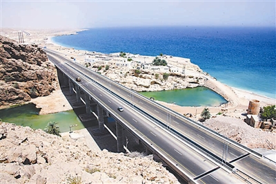 阿曼湾旁古朴的城堡与库苏高速公路交相辉映。库苏高速公路是阿曼第一条由国家银行与外国银行共同融资兴建的道路,全长89. 74公里,是首都马斯卡特连接中部沿海最大城市苏尔的一条重要通道。这条今年早些时候通车的高速公路目前运营良好,印证着建设者中国铁建十八局集团为中阿友谊作出的贡献。刘文 摄