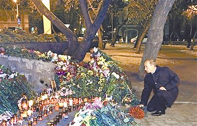 俄罗斯总理普京7日夜抵达彼尔姆市与当地官员召开紧急会议,并前往夜总会吊唁遇难者,图为普京献上花束表示哀悼。瘸腿马夜总会火灾死亡人数目前已达118人。阿健 供图