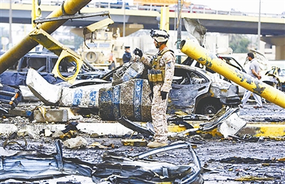 伊拉克首都巴格达8日接连发生5起汽车炸弹爆炸,目前已至少造成100余人死亡,数百人受伤,伤亡人员中包括多名妇女和学生。图为美军士兵正在清理现场。