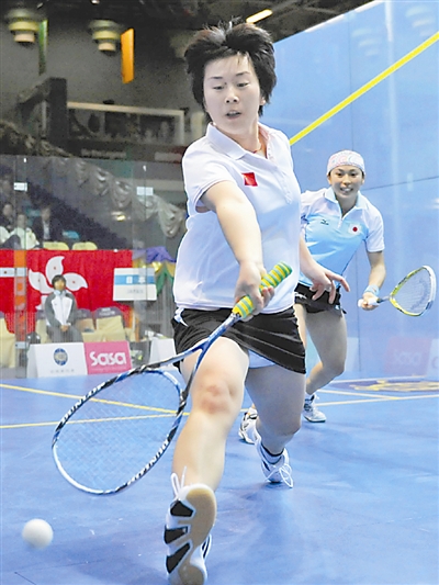 12月8日,中国队球员吴珍珍(前)在比赛中。当日,在第五届东亚运动会壁球女子团体半决赛中,中国队以0比2不敌日本队,无缘决赛。