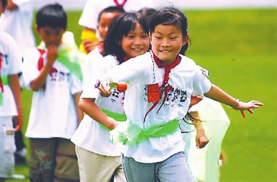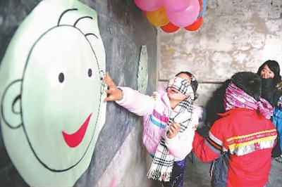 2009年11月22日,通州区自奋希望小学的孩子们上了一次特别的音、体、美课,这是北京林业大学学生们精心准备的“国际儿童日”礼物。图为打工子弟学校的同学们在玩贴鼻子游戏。欧阳晓菲 摄