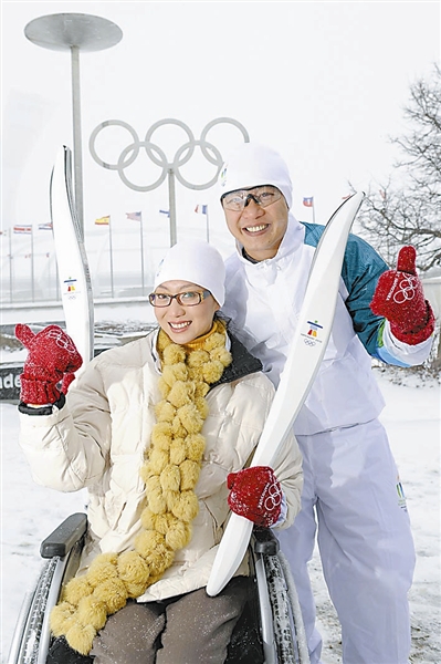 12月9日,中国火炬手刘岩(左)和中国香港歌手陈奕迅在加拿大蒙特利尔的1976年奥运会主体育场外展示冬奥会火炬。当地时间12月10日,刘岩和陈奕迅将在加拿大的蒙特利尔市参加2010年温哥华冬季奥运会的火炬传递。