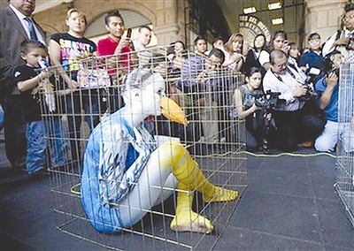 12月9日,在墨西哥城,几名善待动物组织成员化妆成各种被关进笼子的动物,提醒公众不要虐待动物。阿健 供图