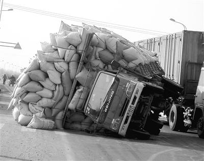 当天下午2时30分,一辆满载着成袋稻谷的机动车由于超载,正晃晃悠悠地向前行驶,当车行驶到新牛公路距离岗埠农场大约100多米处时,由于车上的货物全部集中到一侧,整个机动车顿时不堪重负,车身迅速倾向一边,一下子造成车身无法控制,只听到“哗啦“一声,车上的货物,全部翻向公路,几分钟后,车上的两名驾驶人员,奋力推开已经开始变形的车门,慌忙从驾驶室爬了出来。
