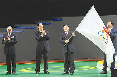 12月13日,天津市市长黄兴国(右二)接过东亚运动会会旗。当日,2009东亚运动会在香港闭幕。 新华社记者 宋振平摄
