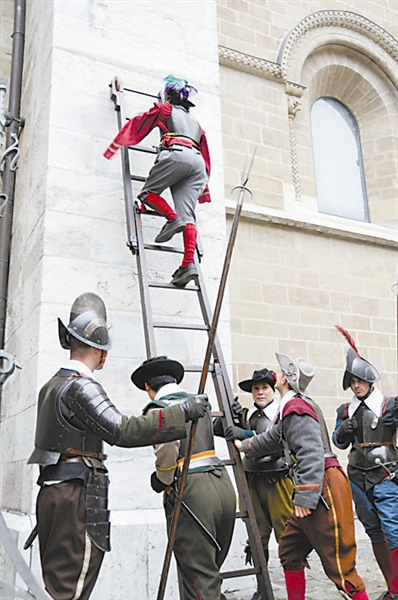 13日,在瑞士日内瓦,古装武士在登城节上演示架梯登城。当日,日内瓦老城举行登城节庆祝活动,身着古装的市民再现17世纪古城生活与战斗场景,纪念1602年12月11日深夜全城军民奋起抵抗,击败从附近萨瓦公国前来偷袭的雇佣军。新华社记者 杨京德摄