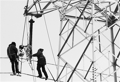 工人们在塔克拉玛干沙漠腹地的高压线路铁塔上作业(12月9日摄)。一条穿越“死亡之海”塔克拉玛干沙漠的220千伏输电线路正在加紧建设。线路北起塔克拉玛干沙漠北缘的轮台县,一期工程到达沙漠腹地的塔中油田,全长322公里,总投资10.12亿元。工程建成后将实现向沙漠油气产区供电的任务,未来还将解决地处沙漠南缘的且末、若羌等县的用电问题。 新华社记者 曹志恒 摄