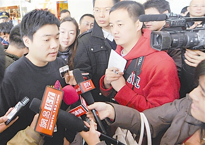 12月16日,丁俊晖(左)在北京首都国际机场接受媒体采访。当日,刚刚夺得斯诺克英国锦标赛冠军的中国选手丁俊晖从英国载誉归来。 新华社记者 孔卉摄