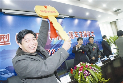 12月17日,在北京长征天民高科技有限公司培训室,来自湖北宜都市科协的高勤高兴地向来自全国各地科协的同行们展示刚刚领到的科普大篷车钥匙。当天有49辆大篷车被分配到了全国各地。科普大篷车是中国科协科普工作的品牌项目,目前全国已经有科普大篷车270辆,累计行驶800多万公里,受惠群众达3000余万人,广受贫困偏远地区群众的欢迎,被称为“流动的科技馆”。本报记者 杨登峰摄