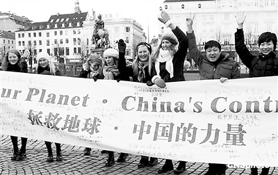 哥本哈根的游行队伍中,出现了“修身,齐家,治国,救气候”这样的中文标语。有报道称,一位中国福建商人还自掏腰包资助15名雇员赶到哥本哈根,拉起写着“拯救我们的地球,中国出一分力”的横幅。