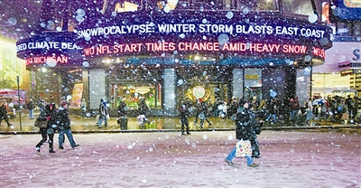 12月19日,在美国纽约时报广场附近,游客走过写有“东部海岸遭到暴风雪袭击”的电子广告牌。当天,纽约迎来今年入冬以来的首场大雪。部分地区降雪量将达到50厘米厚。新华社记者 朱炜摄