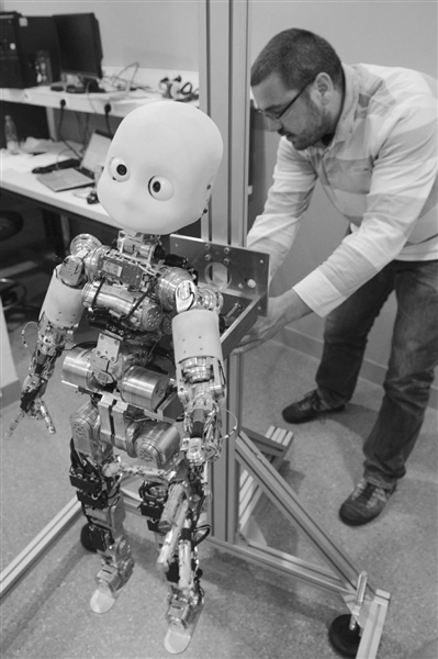 9月4日,法国比埃尔和玛丽·居里大学的樊尚·帕杜瓦教授在巴黎展示ICub智能机器人。