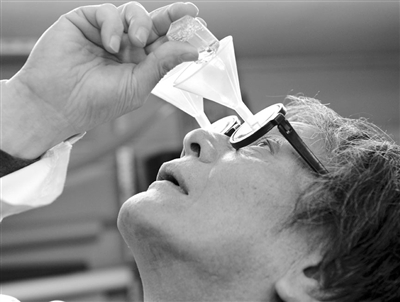 6月3日,日本珍道具学会创始人、发明家川上贤司在日本东京演示能帮助使用者滴眼药水的漏斗眼镜。
