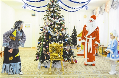 12月23日,在俄罗斯首都莫斯科,小朋友和严寒老人做游戏。当天,莫斯科2639幼儿园的小朋友们和严寒老人一起迎接新年的到来。 新华社记者 张亚晨 摄